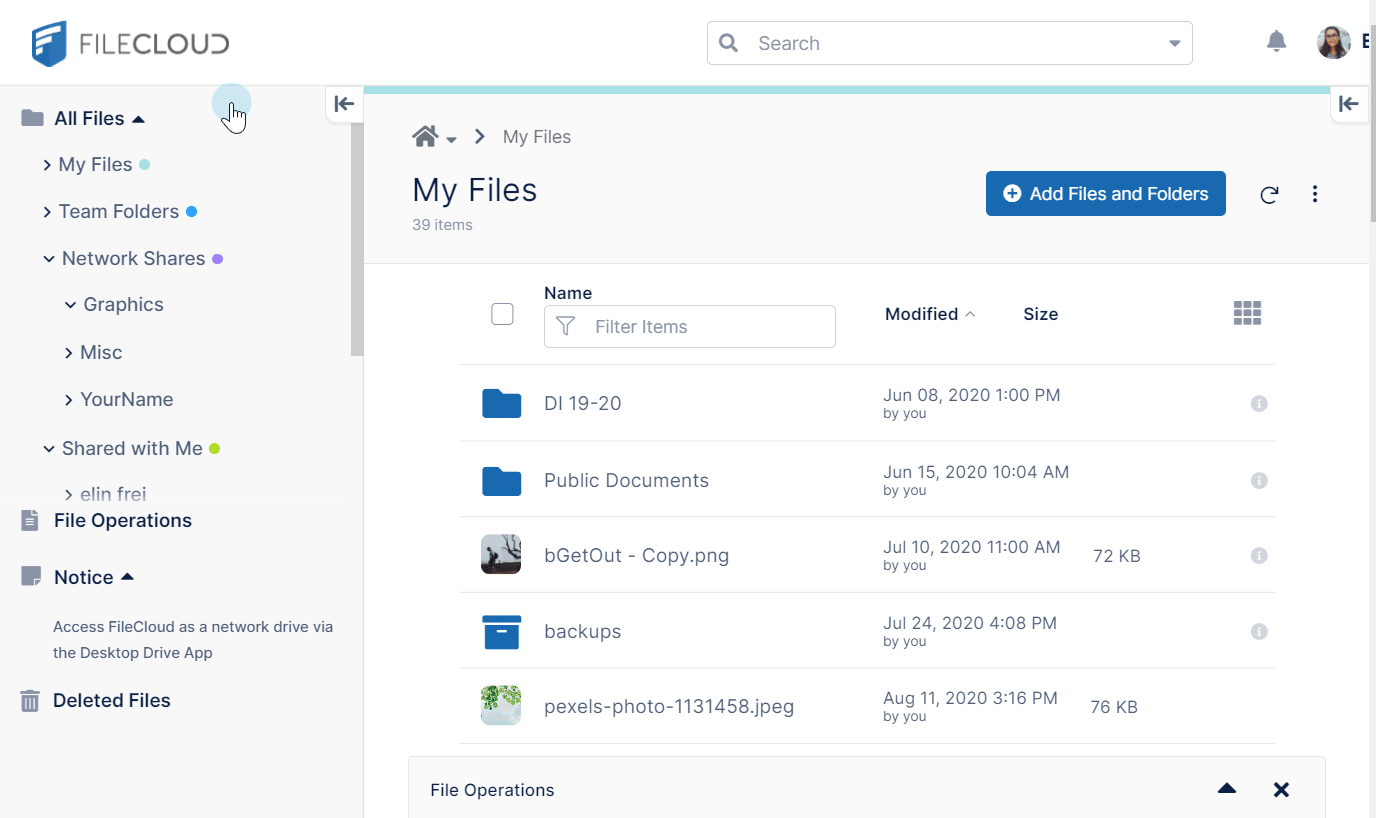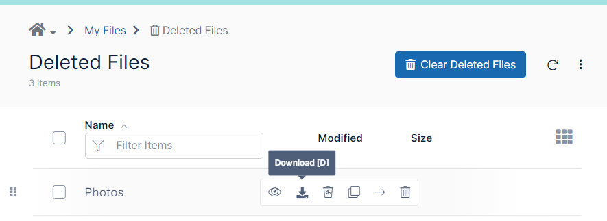 To restore a file or folder deleted from a network share, navigate to the specific network share folder, and click Deleted Files in the navigation bar. Navigate to the file or folder, hover over its row, and click the Restore icon.