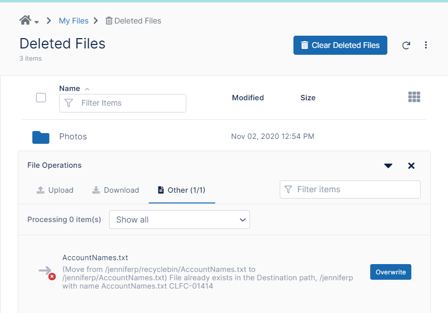 In Deleted Files, when you click Restore on a file, if there is currently a file with the same name in the folder that you are restoring to, FileCloud prompts you to confirm that it should overwrite the existing file.