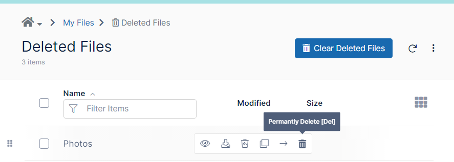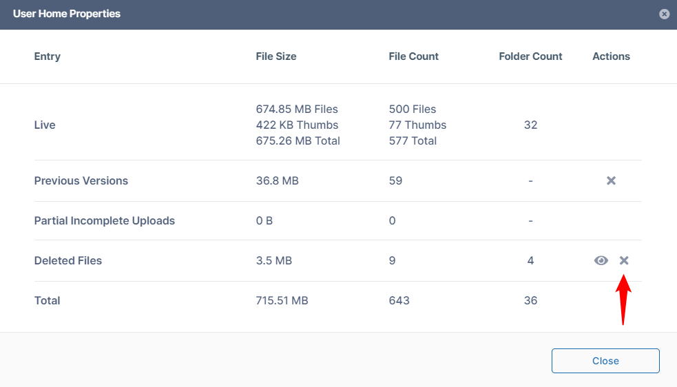 - Click x in the row for Deleted Files to permanently delete the files deleted from the folder.
