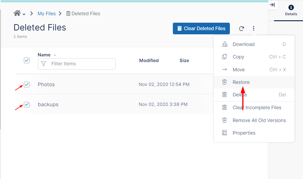 To restore multiple deleted files or folders, click Deleted Files in the navigation bar. Check the box of each file or folder that you want to restore. Click the More icon in the upper-right corner of the screen and choose Restore.