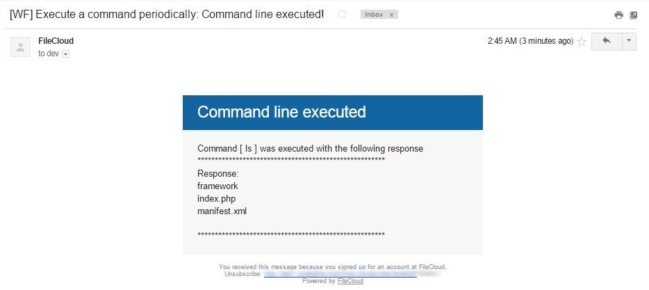 A notification email will be sent to the Admin, with the response information of command line execution.