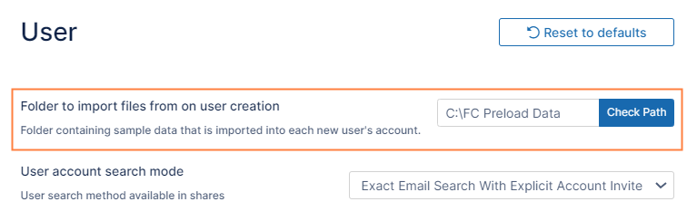 - In Folder to import files from on user creation enter the path containing the files and folders, and click Save.