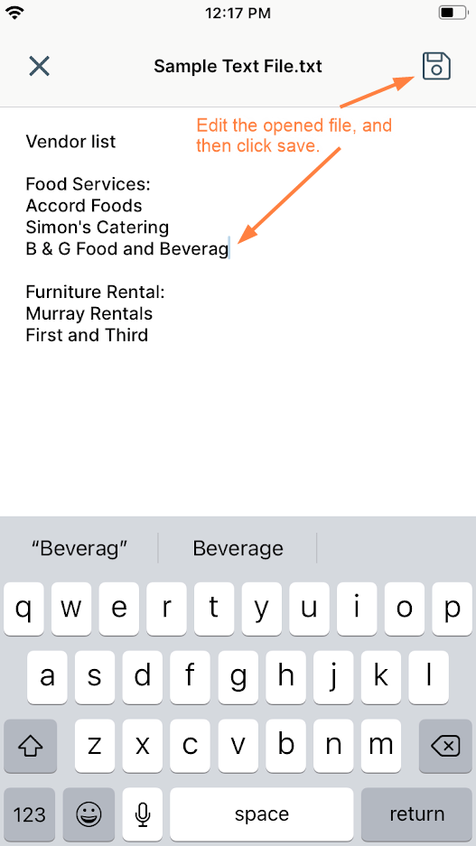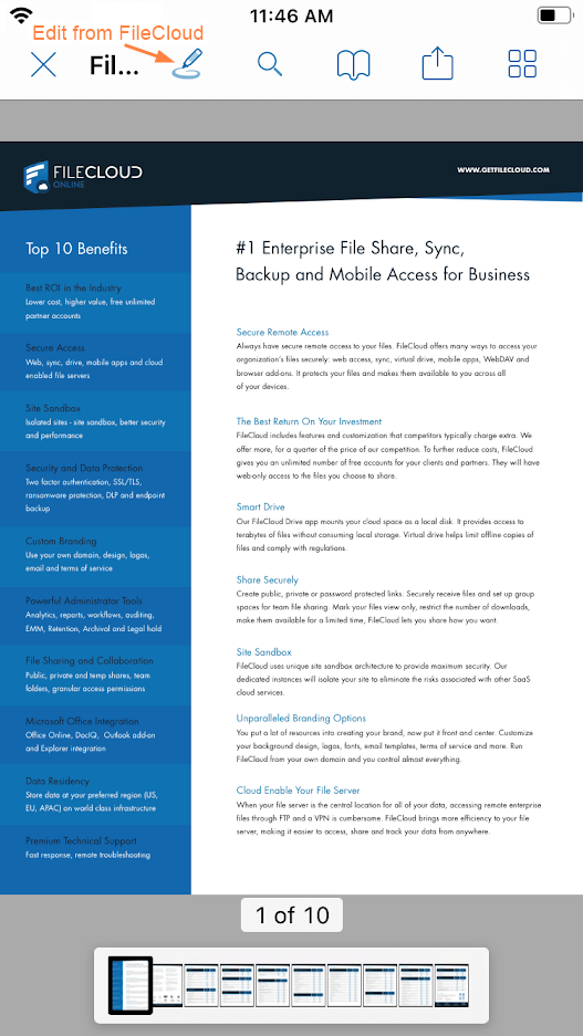 - Preview .pdf and .txt files and edit them in the FileCloud iOS application. No third-party app is required.