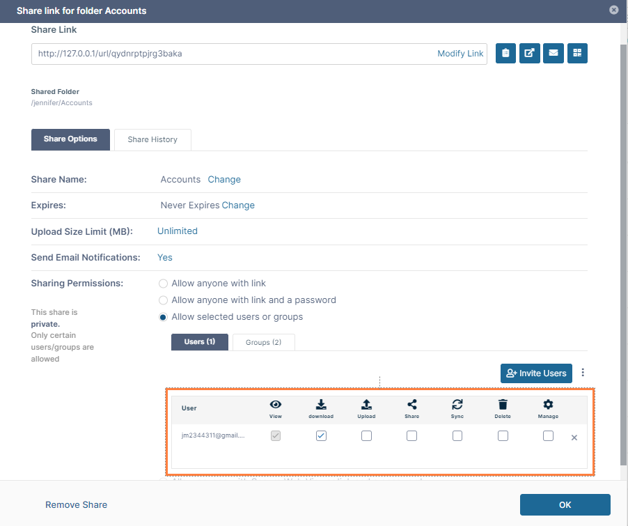 | Share | Share permission allows the user to share the folder contents again with other users. If you enable Share permission, Download, Upload and Delete permissions are automatically enabled; however, you can remove Delete permission. |