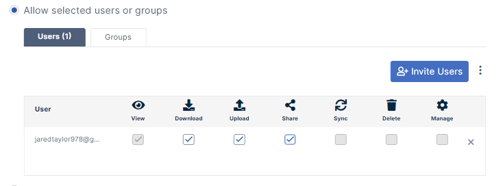 Invite users or groups to the share and check any of the available permissions. For more details see Private Share Options for Files. Allow anyone with Secure Web Viewer link and a password