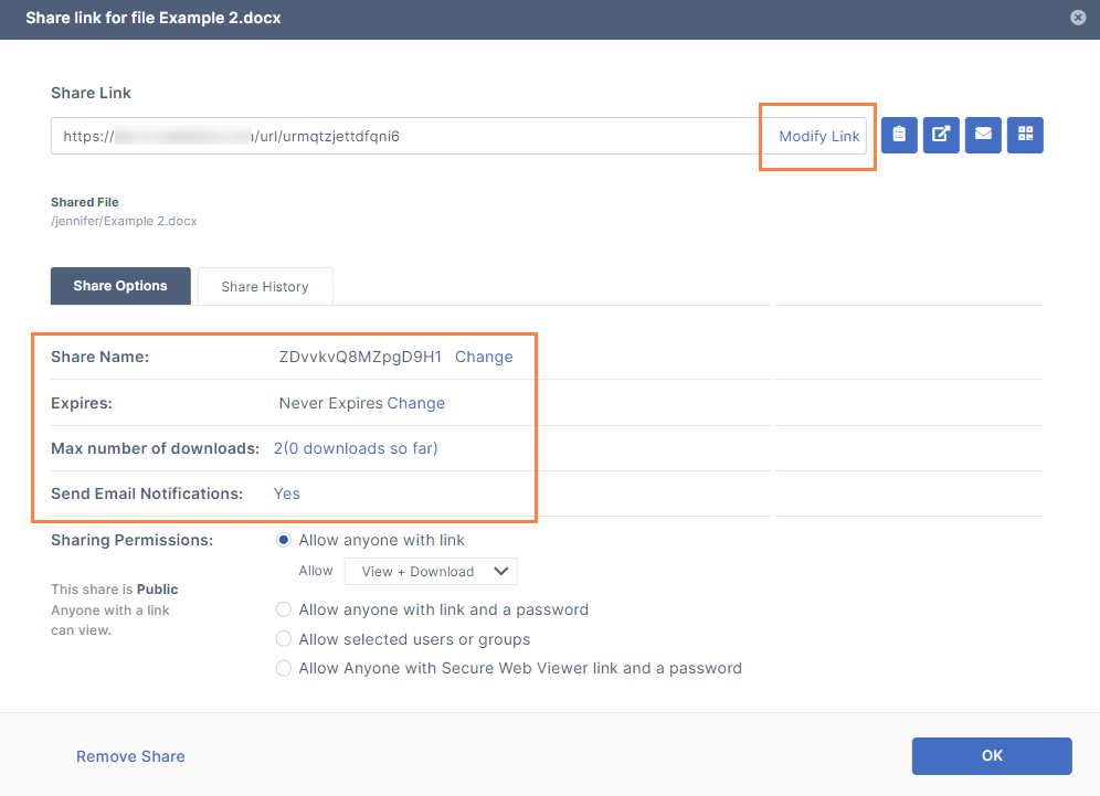 In the Share Link dialog box, you can configure how you share a public file by changing the settings on the Share Options tab.