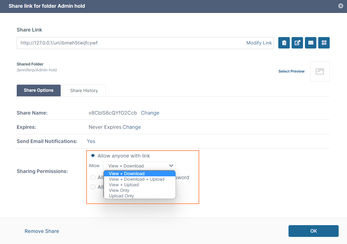 | Upload | Upload permission enables a user to save content to the shared folder. |