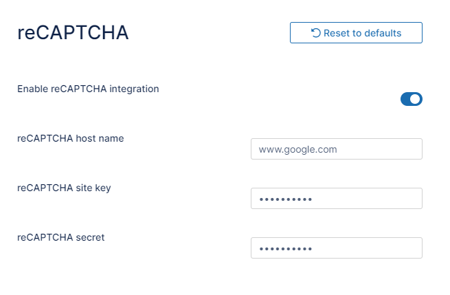 - Enable the setting Enable reCAPTCHA integration.