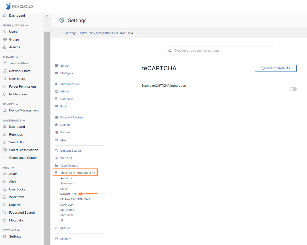 FileCloud supports reCaptcha v2. When you enable reCaptcha integration, reCaptcha is applied when users log in to FileCloud and when they access a password-protected file or folder share.