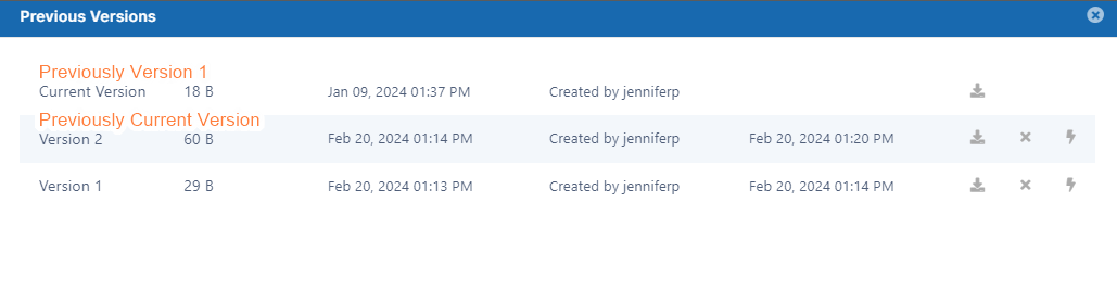 In versions of FileCloud prior to 20.2, current versions are always removed when another version is restored. Beginning with Version 20.2, by default, the current version is saved when another version is restored.