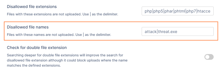| Restrict any file from being uploaded if it contains any of the 2 strings in the file name: