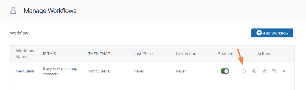 - In the Manage Workflows screen, in the row for the workflow you want to run, click the first arrow under Actions.