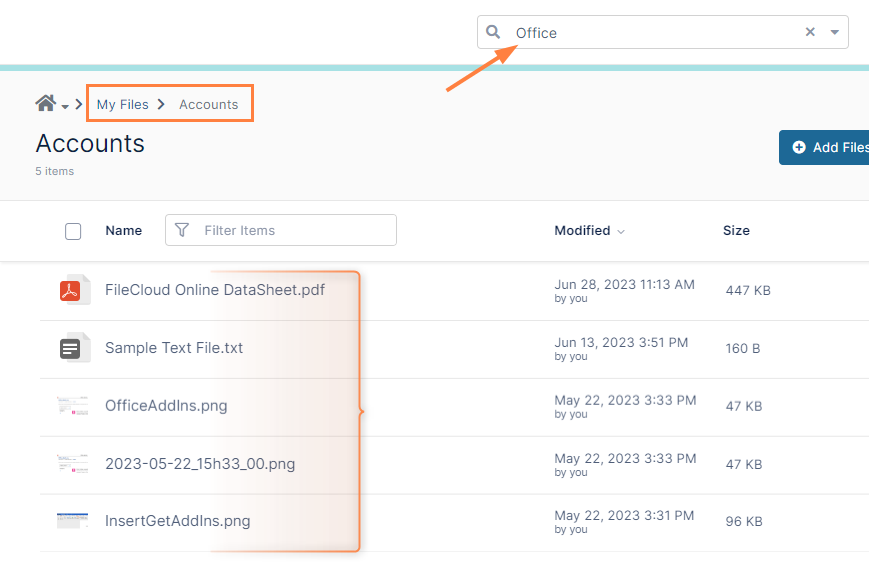 By default, the FileCloud search is global; it searches all content in FileCloud. Your admin may change the default search to only look at the contents of the path you have currently navigated to in the user portal. For example, if you have navigated to My Files > Accounts, as in the following screenshot, the search only looks for the term you have entered in the Search bar in the files and folders in My Files > Accounts (the bracketed content in the screenshot), not all content in FileCloud.