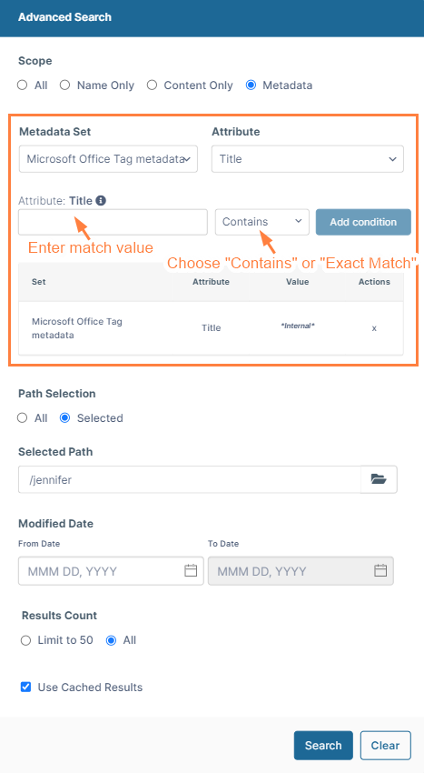 You can return saved results from the search bar, or configure FileCloud to return saved results for an advanced search: