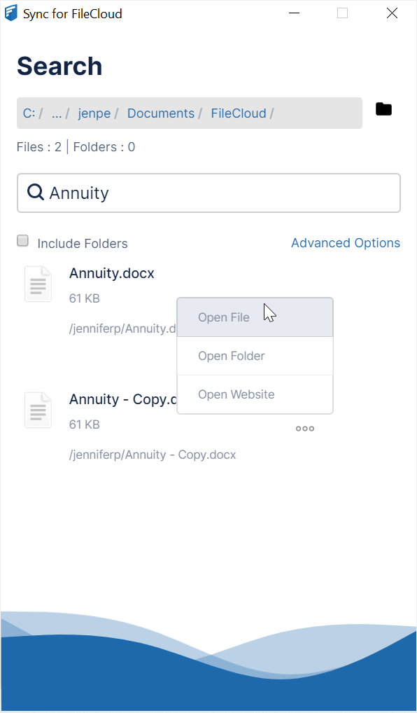 Enter a search term. Searching begins automatically. The files and folders returned are listed in the lower portion of the Search window. Check Include Folders to search folder names as well as file names. | Click Advanced Options in the Basic search to view the Advanced Options fields. Choose any of the advanced options: