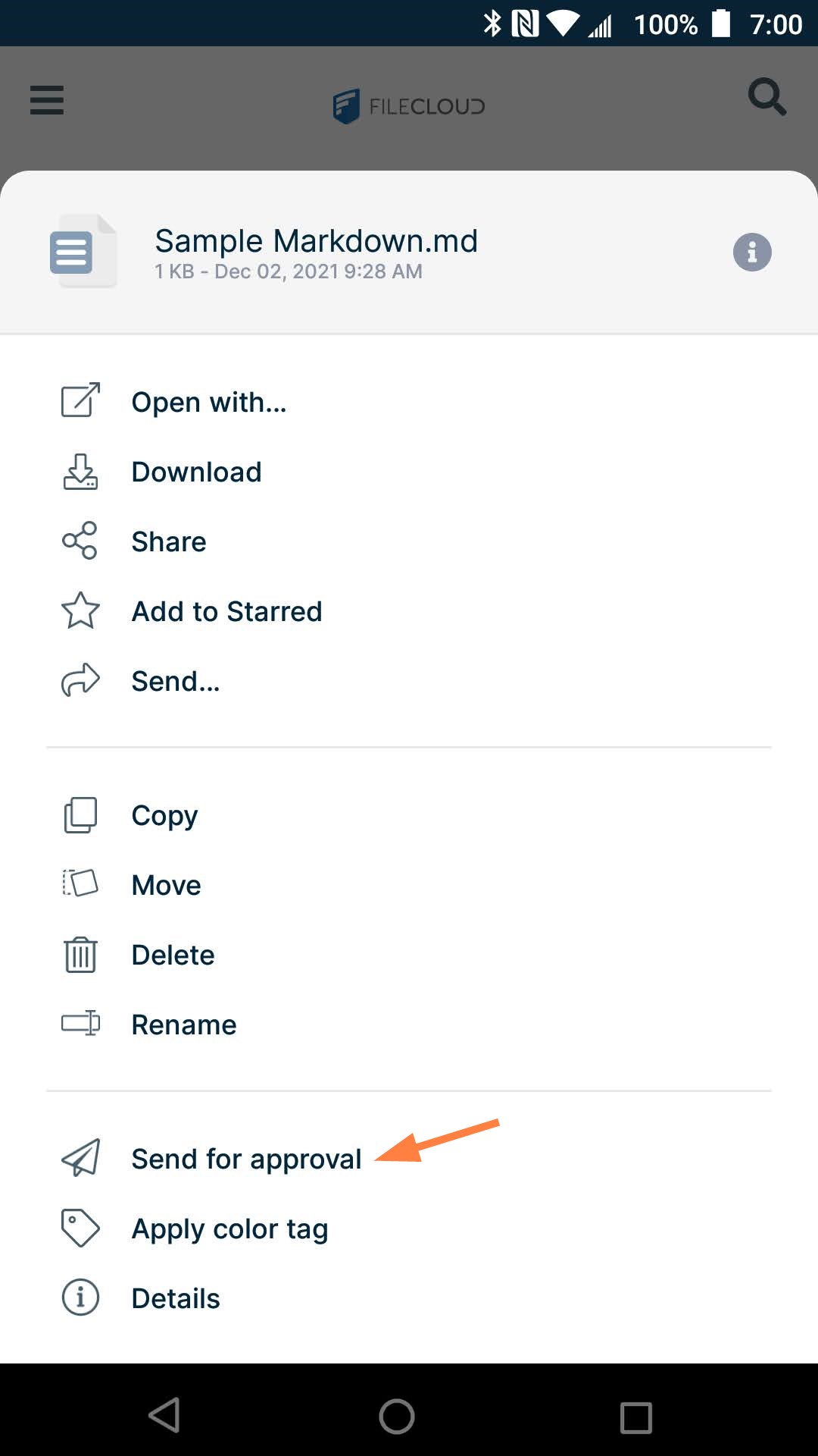 - Log into the FileCloud app and navigate to the file that you want to send for approval.