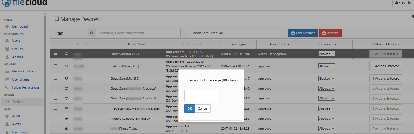 The entered message(s) will be displayed when the remote client is connected to the FileCloud instance. If more than one message is queued to a device, they will be