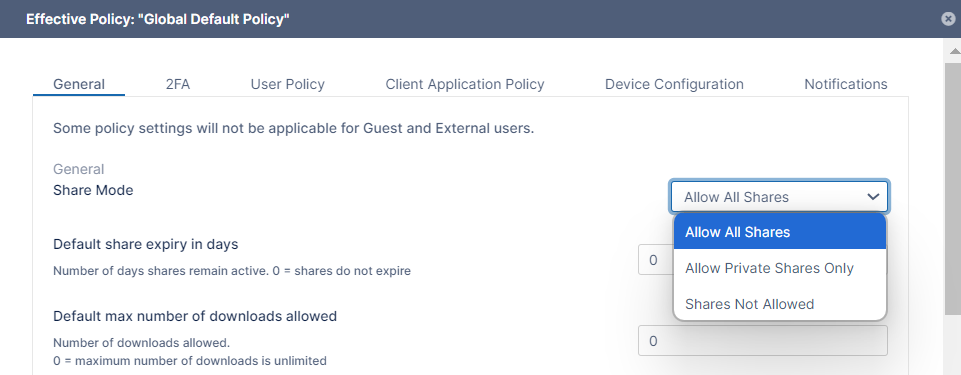 The Share Mode setting appears in policies on the General tab of a policy, and is set to Allow All Shares by default.