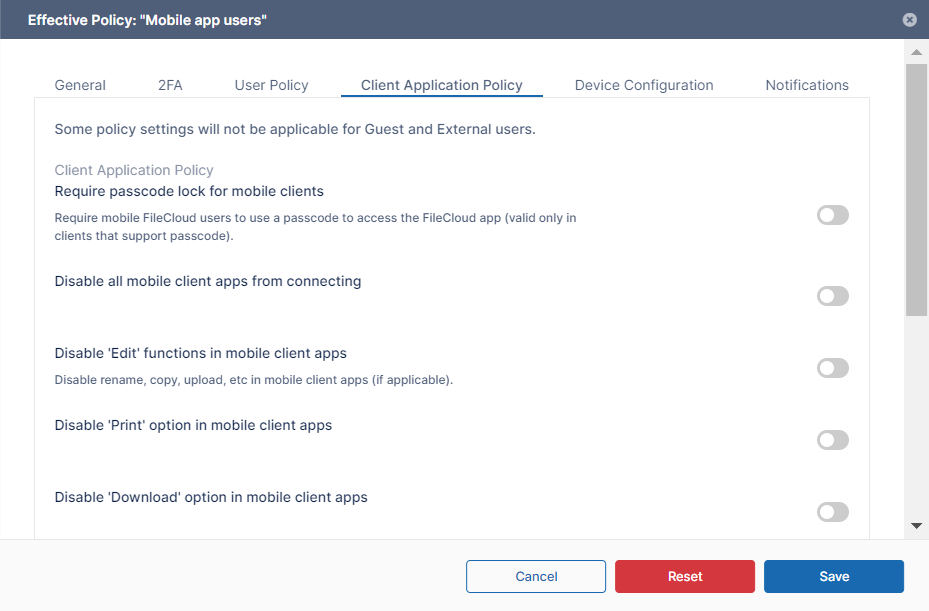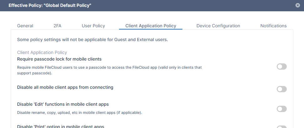 | Disable all mobile client apps from connecting | Prevent login to FileCloud system using mobile client apps (users are allowed to login only via the web browser). |