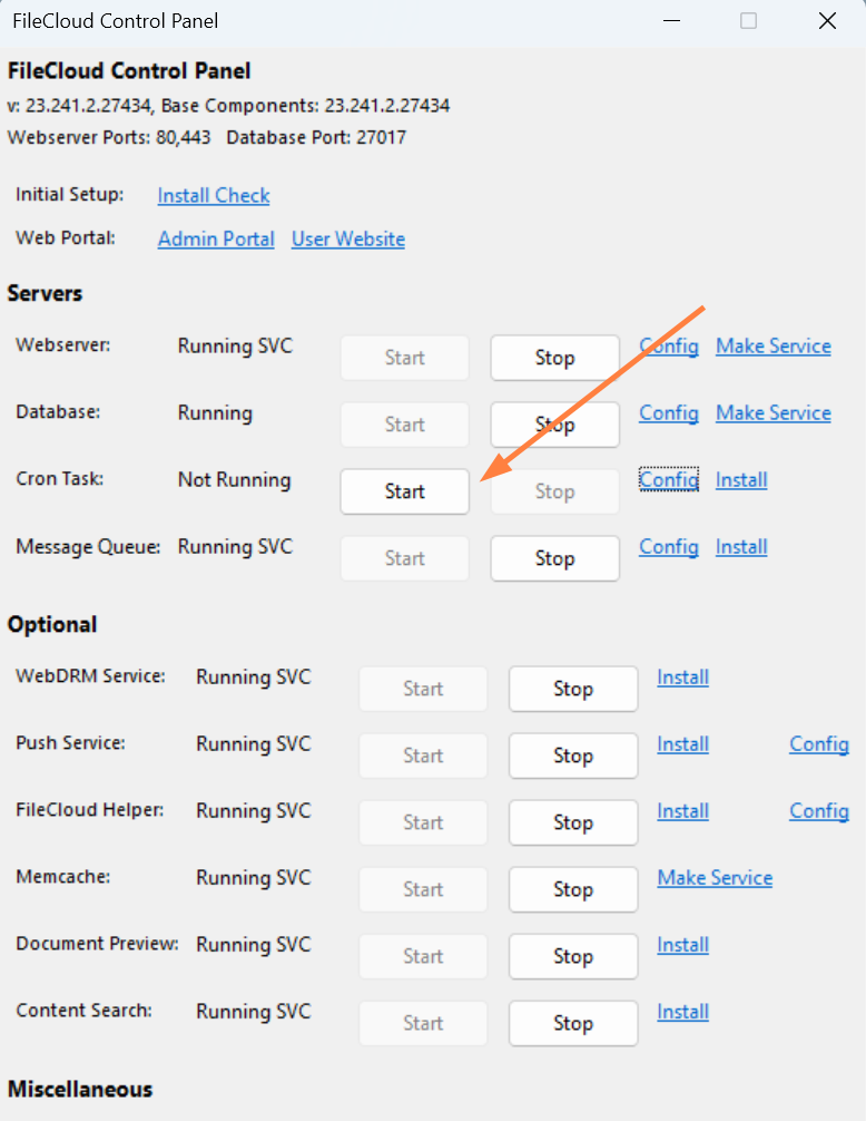 Open the FileCloud Control Panel and click Install for the Cron Task.