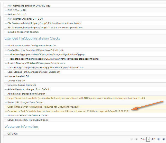 Under Extended FileCloud Installation Checks, check the Cron status in the lines highlighted below.