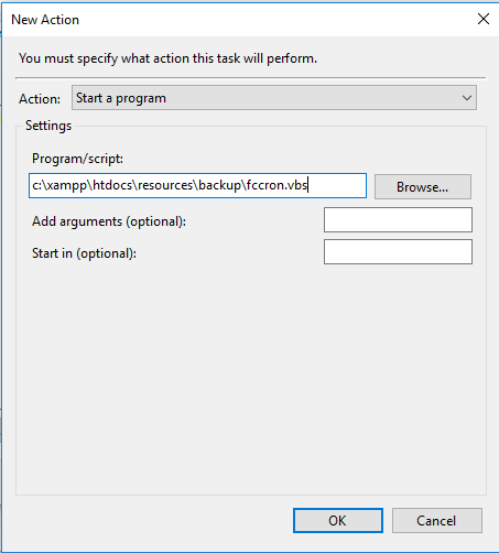 In the Program/script text box, enter the path to the fccron.vbs file, (for example, c:\xampp\htdocs\resources\backup\fccron.vbs).