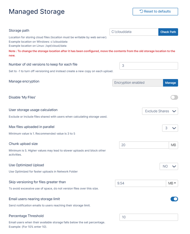 Note: If you are using Network Folders with S3 storage, if you use server-side encryption with a customer key (SSE-C), optimized upload will fail due to security reasons.Skip versioning for files greater than Any file larger than the specified value will not be versioned. Email users nearing storage limit If this option is enabled then automatic emails with notifications will be sent to users reaching their storage limit. Percentage Threshold Defines at what point the percentage of unused managed storage space is considered low. For example, if the value is set to 20, then storage is considered low if more than 80% of managed storage space is used.