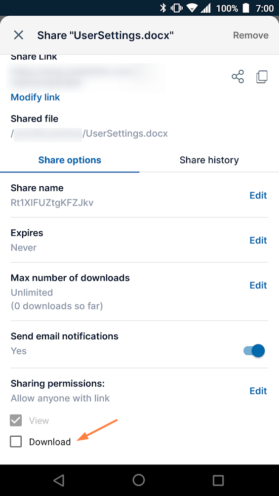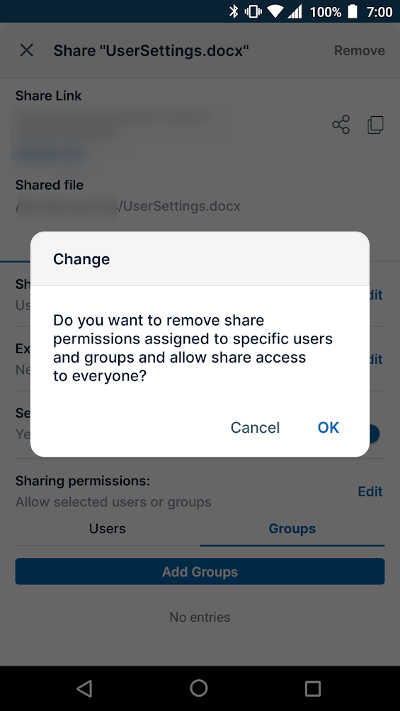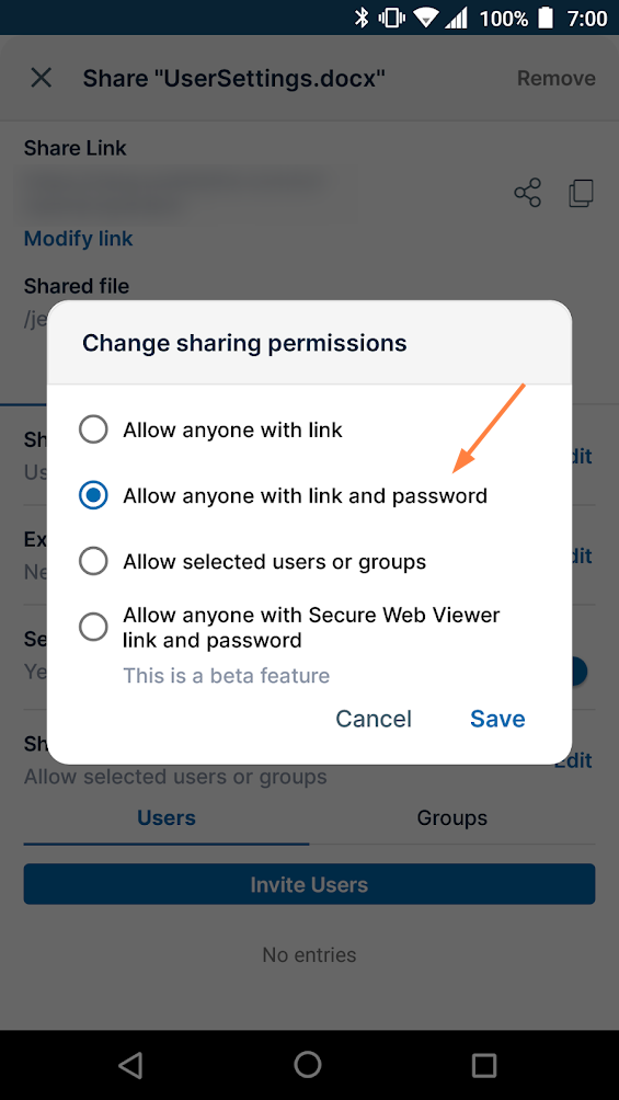 Tap OK. Allow anyone with link and password replaces Allow selected users or groups. Note: If the optionAllow anyone with Secure Web Viewer link and a passwordappears, the file is available for viewing in the Secure Web Viewer, which protects files with digital rights management (DRM) features. See Using the Secure Web Viewerfor help with this option.