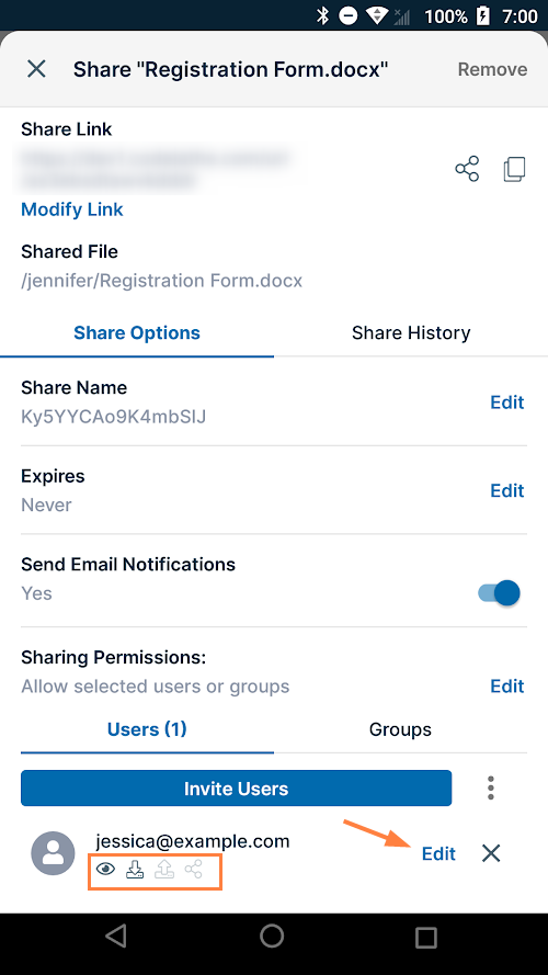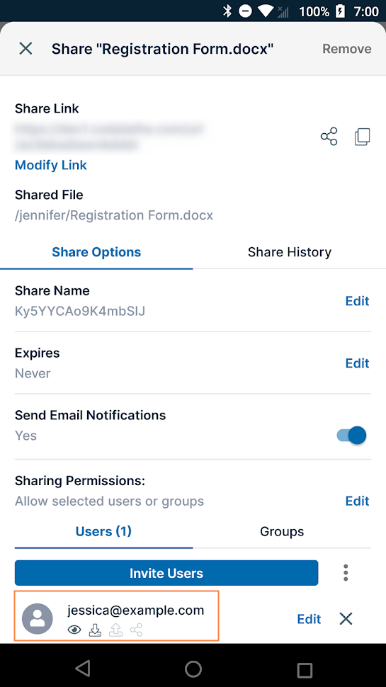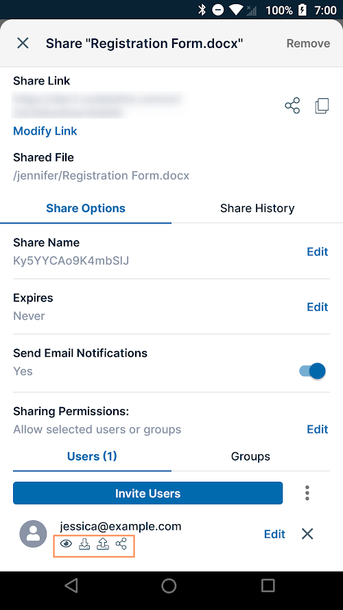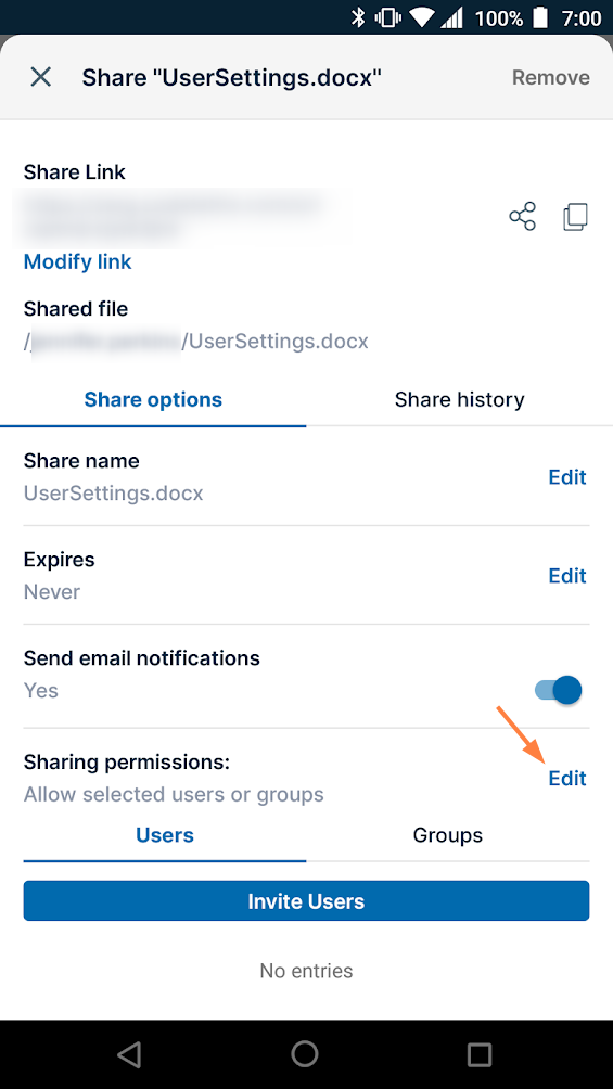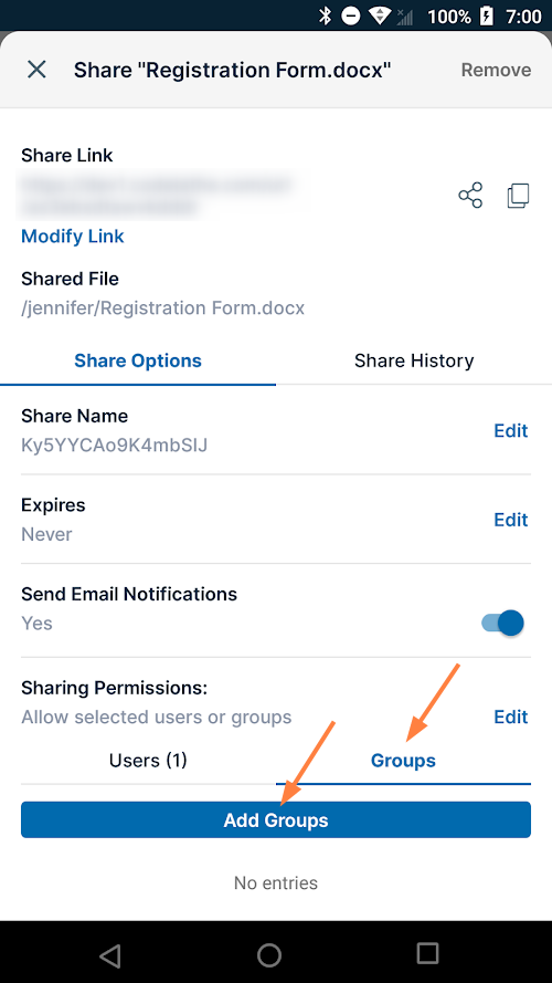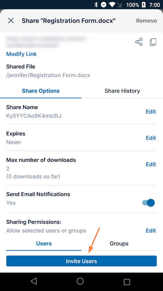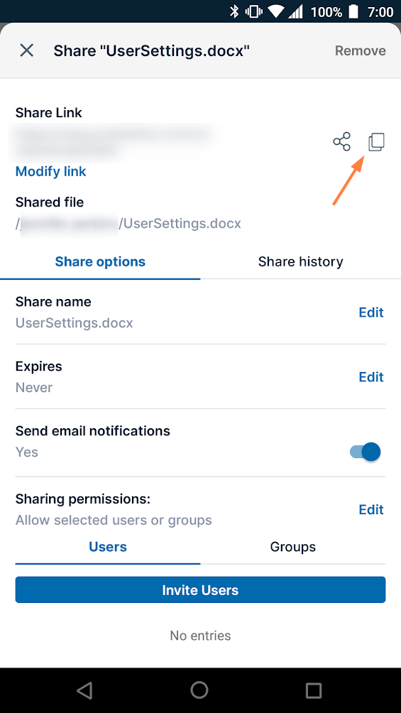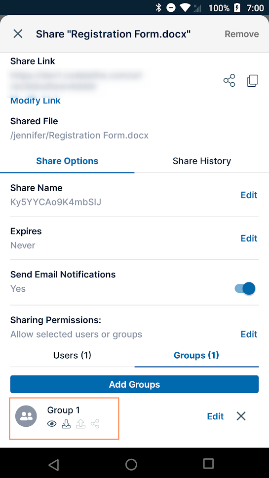 Tap Share. The file is automatically shared privately, and a screen for accessing share options and adding users and groups to the share opens.