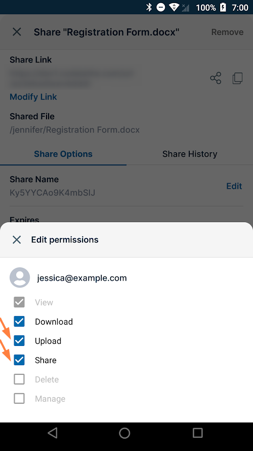 Note: Checking Share permission gives the group both upload and share permissions for the file.