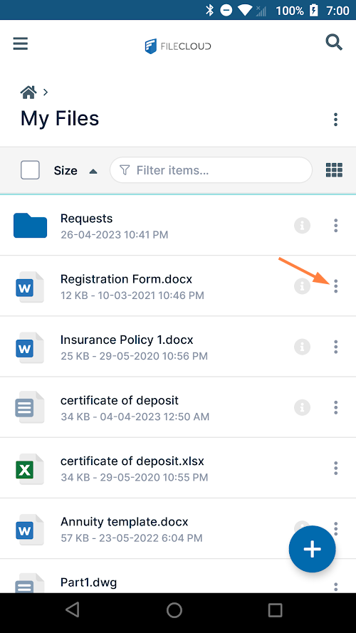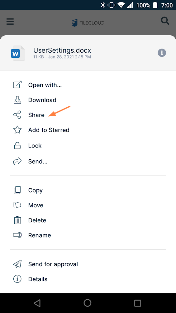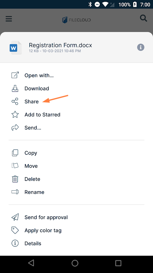 You can use the FileCloud app to share files on your mobile device with others. You can: