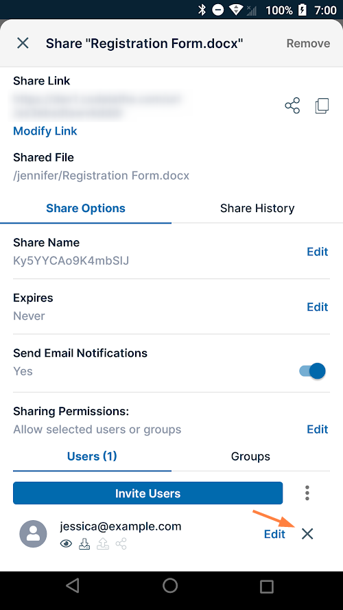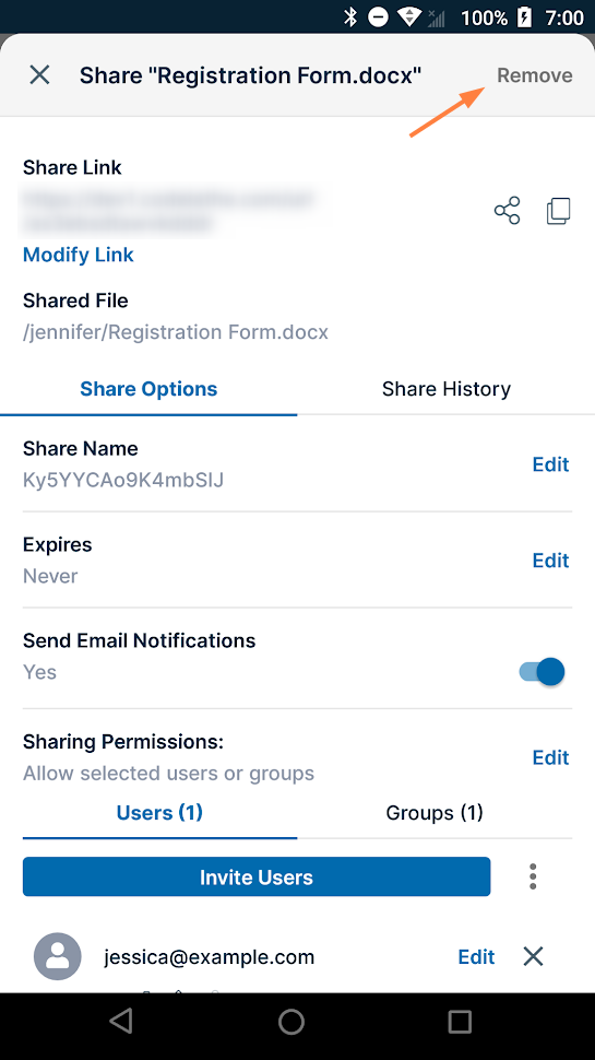 Tap Remove. The share is removed. Users who were given access to the share can no longer view it in their Shared with me files or access it through the share link.