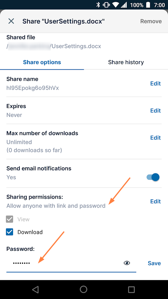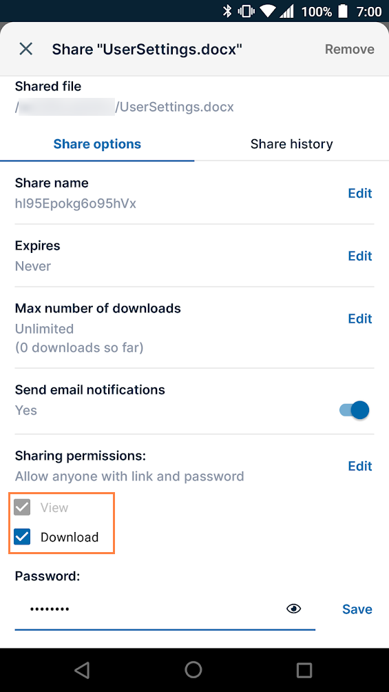 In the Password field, leave the existing password, or enter another one, and then click Save. Users must now enter the password to access the share from the link.