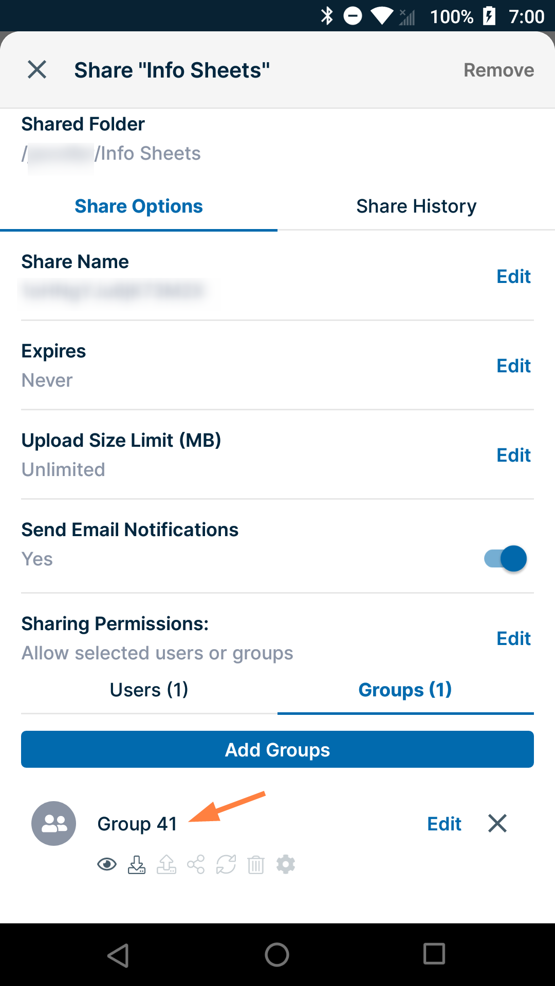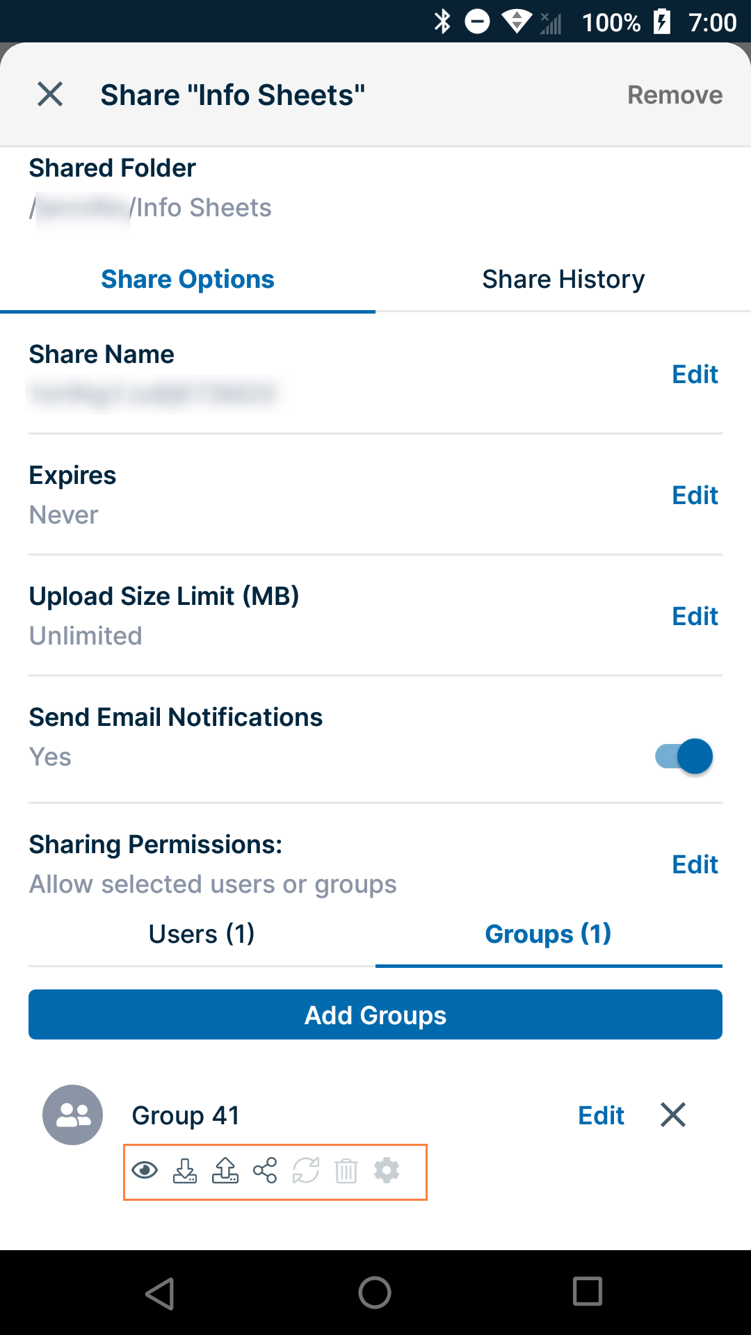 The folder is automatically shared privately, and a screen for accessing share options and adding users and groups to the share opens.