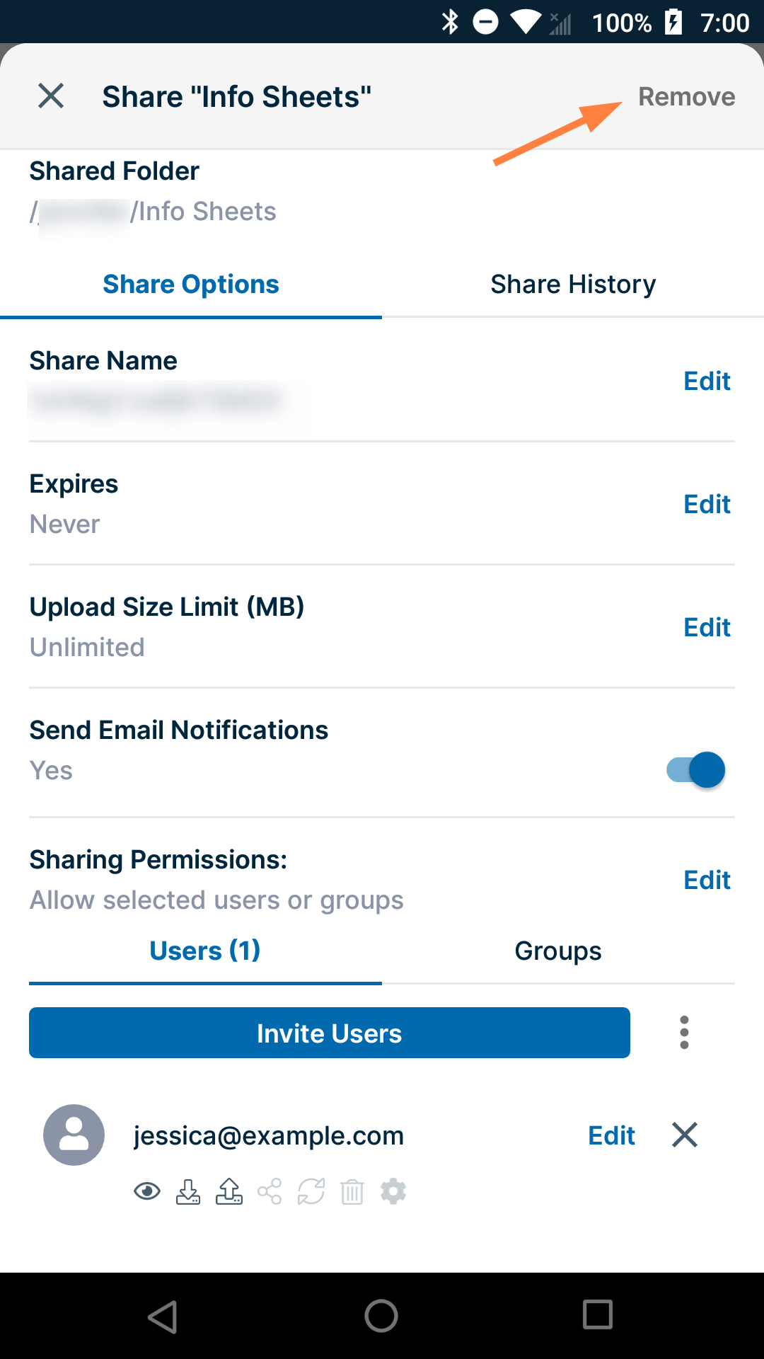 To remove a user or group from a folder share: