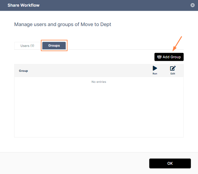 - To share the workflow with groups, click the Groups tab and click Add Group.