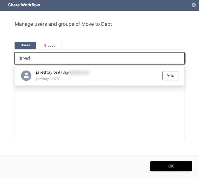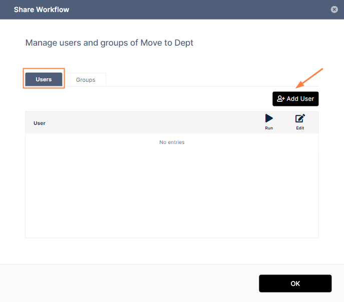 A Share Workflow dialog box opens. - To share the workflow with other users, leave the Users tab selected and click Add User.
