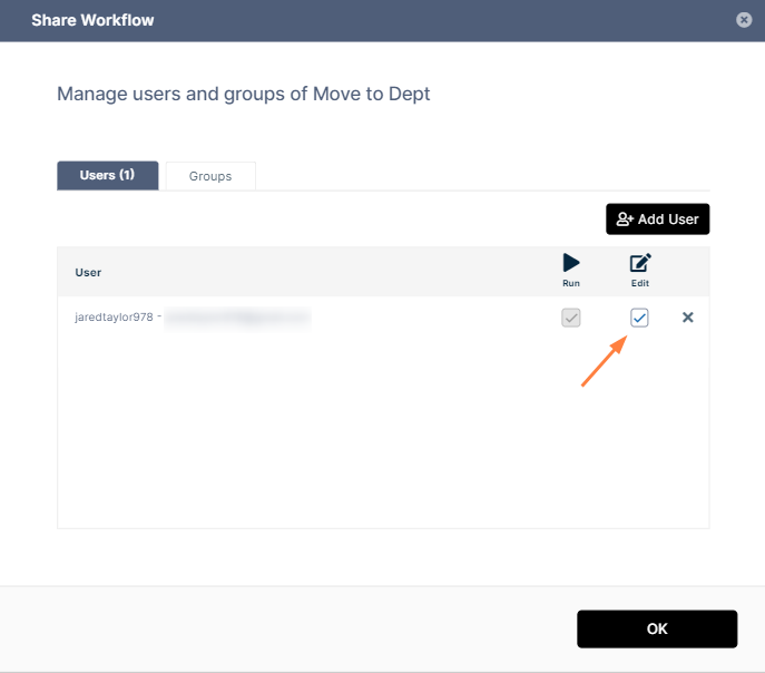 The user is added. A shared workflow can always be run by the share recipient, so Run is checked and cannot be unchecked. - To also enable the share recipient to edit the workflow, check Edit.