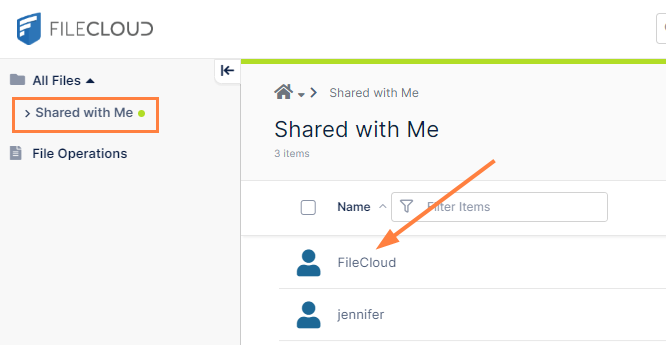 When you share a Team Folder with an external user, the folder appears under Shared with Me, and the name of the user who created the share is the Service Name (the value in Settings > Server > Service Name).