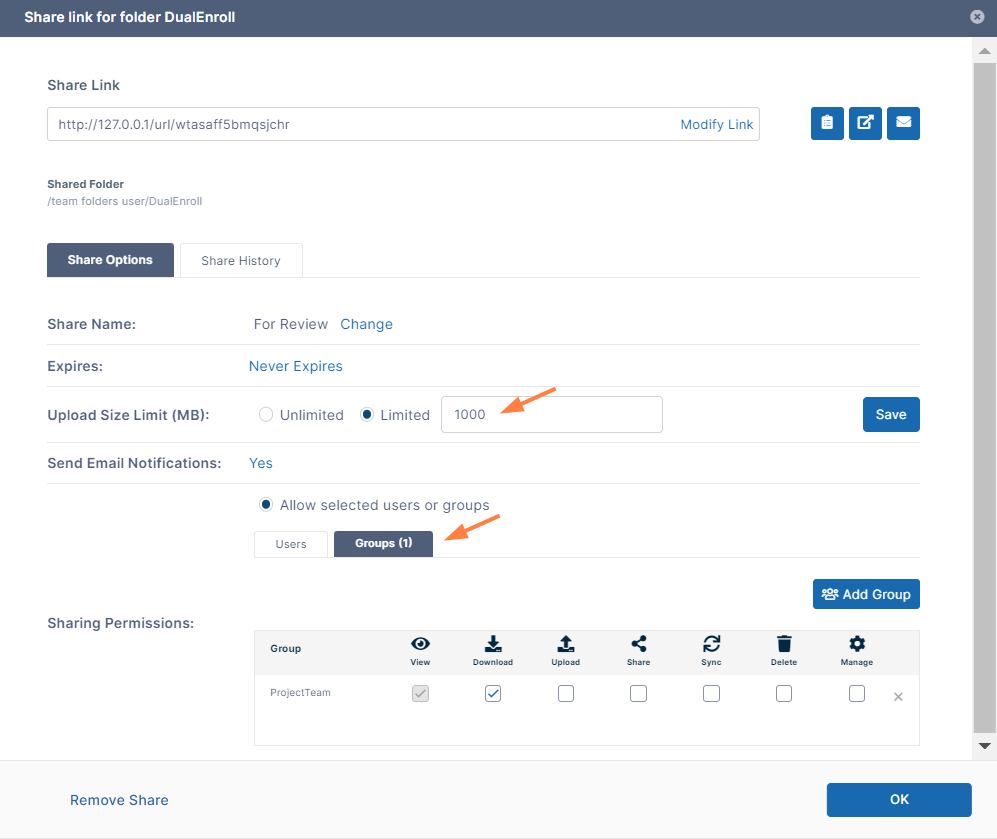 For example, you may want to share the folder with a specific group only or limit the upload size.