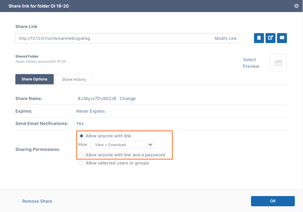 - In the Share link for folder dialog box, configure the settings for the share.