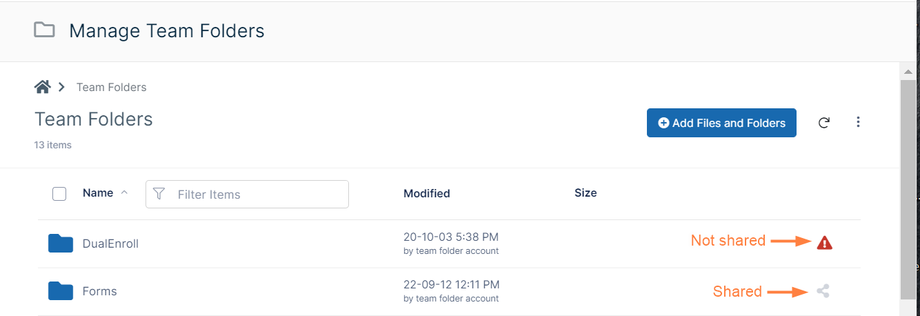 - The row for a Team Folder displays a share icon if it has already been shared or a warning icon if it has not been shared.