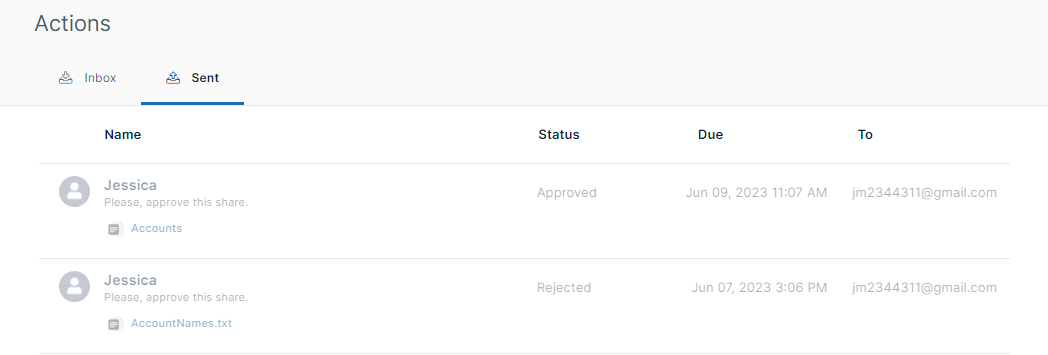 The Actions screen opens with the Inbox tab selected. - Click the Sent tab.