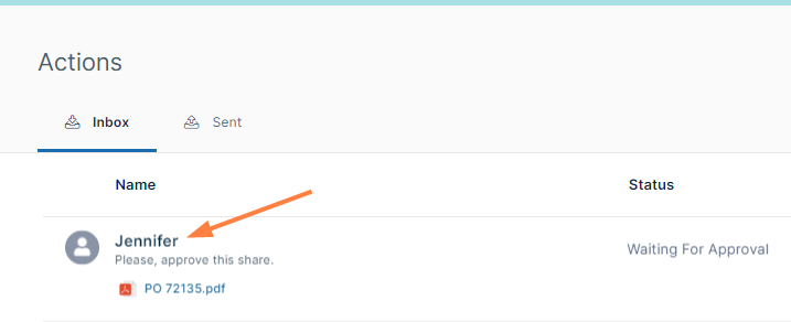 Your share that was sent for approval is listed by the name of the approver. Its status and the filename are also listed. - To see more details about the file and add any comments for the approver click the username above the file.