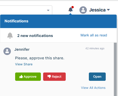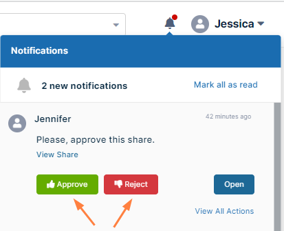 - You can do this by clicking the Notifications icon at the top of the screen, and in the notification listing about the share, clicking the Approve or Reject button.