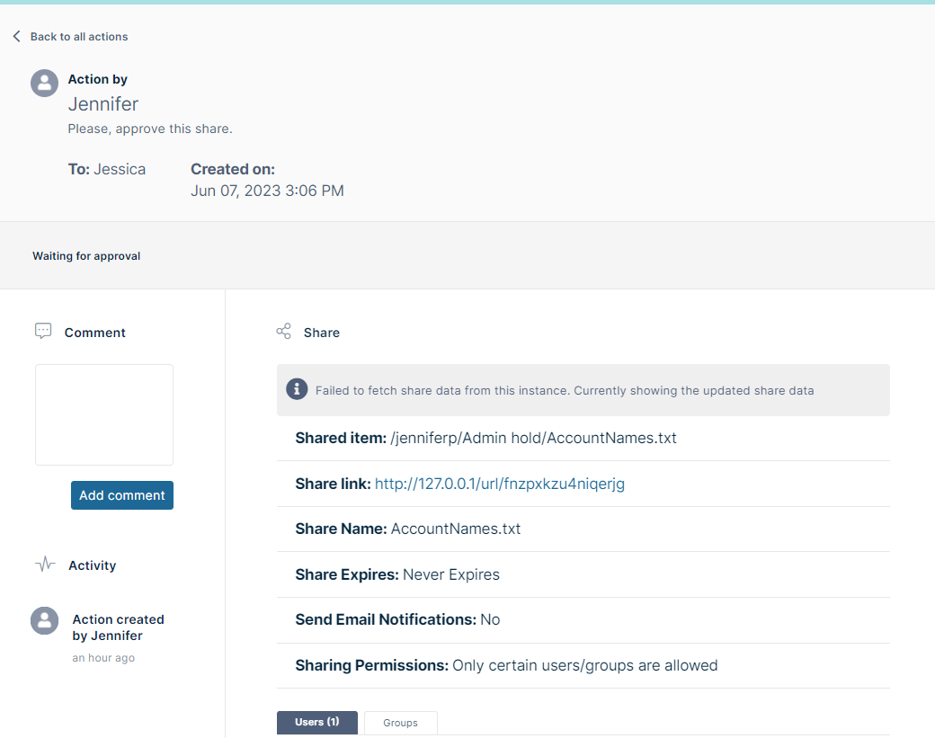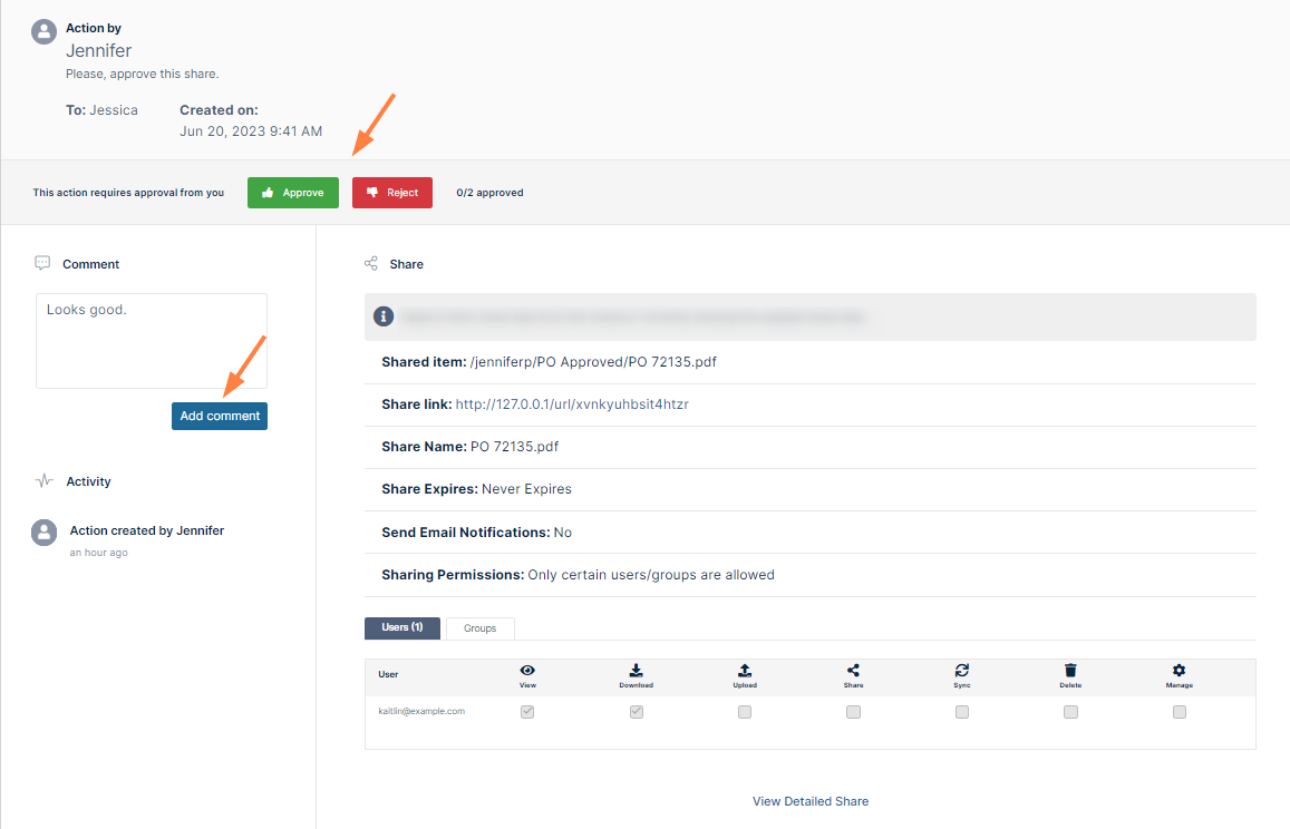 If the share is approved, the users or groups shared with can now access it. If the share is rejected, it is deleted.
