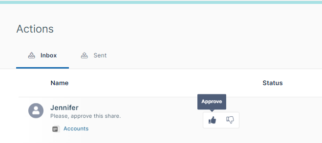 The Actions page opens to the Inbox, where you can hover over the listing for the share and click the thumbs up or thumbs down icon to instantly approve or reject it: