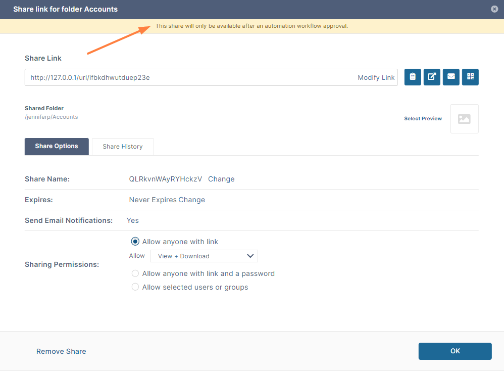 If approvals are required on shares in your system, when you share a file, a ribbon appears at the top of the Share Link box indicating that the share will become available after approval.