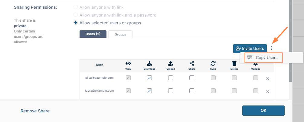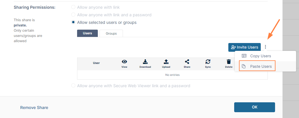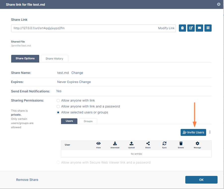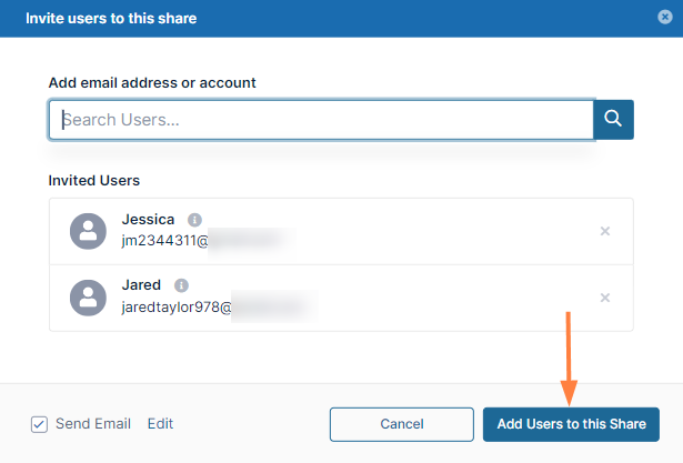 3. On the Users tab, click Invite Users to add individual users to the share. (To copy users from one share to another, see Copy and paste users to shares, below.)
