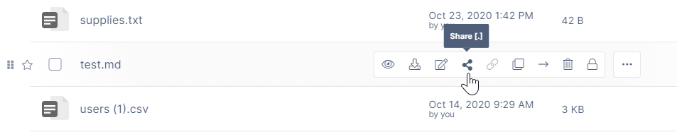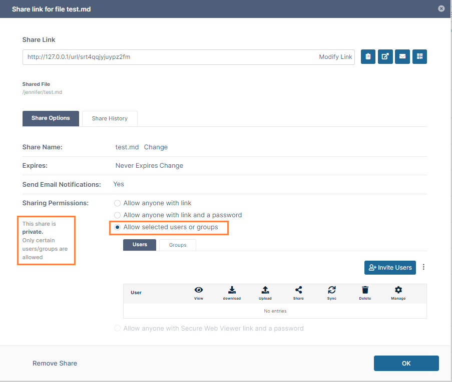 By default, only View, Download, Upload and Share permissions are available on private shares. You cannot remove View permission because that would remove the share; however, if you want to remove the share, click x at the end of the row.
